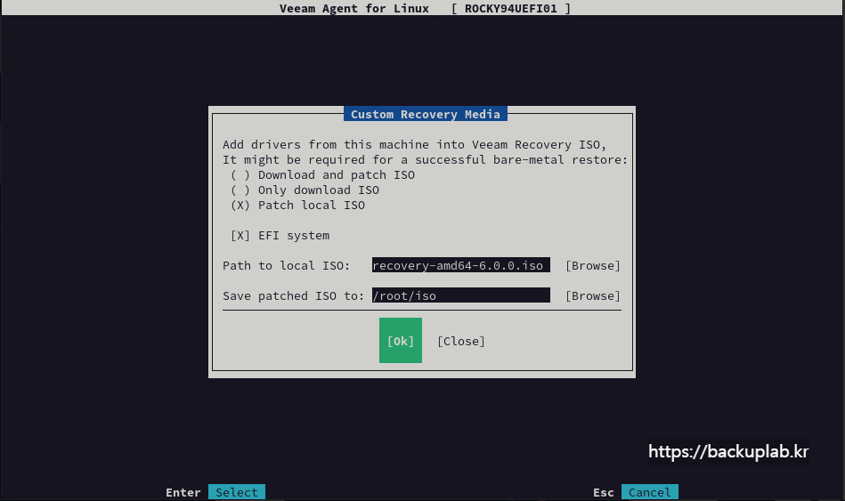 veeamconfig patchIso --input /root/iso/veeam-recovery-amd64-6.0.0.iso --output /root/iso/veeam-recovery-amd64-6.0.0-ROCKY94UEFI01.iso --efi
