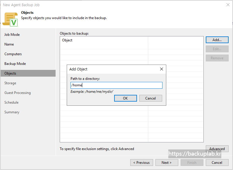 백업에 포함할 파일이 있는 디렉토리를 정의하여 백업 범위를 지정하기 위해, Add 클릭.