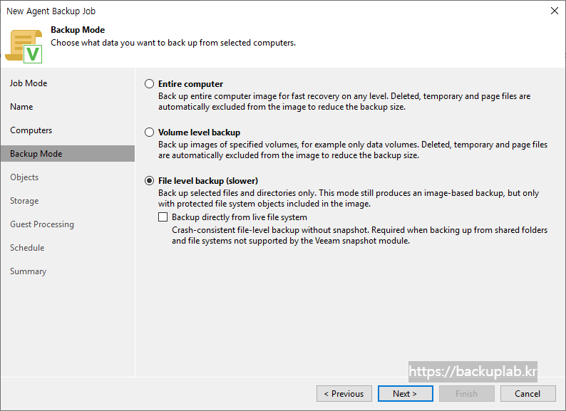 Backup Mode 단계에서 컴퓨터의 개별 폴더의 백업을 만들려는 경우, File level backup 을 선택.
