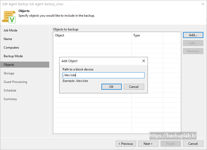 Objects 단계에서 백업에 포함할 볼륨을 정의.