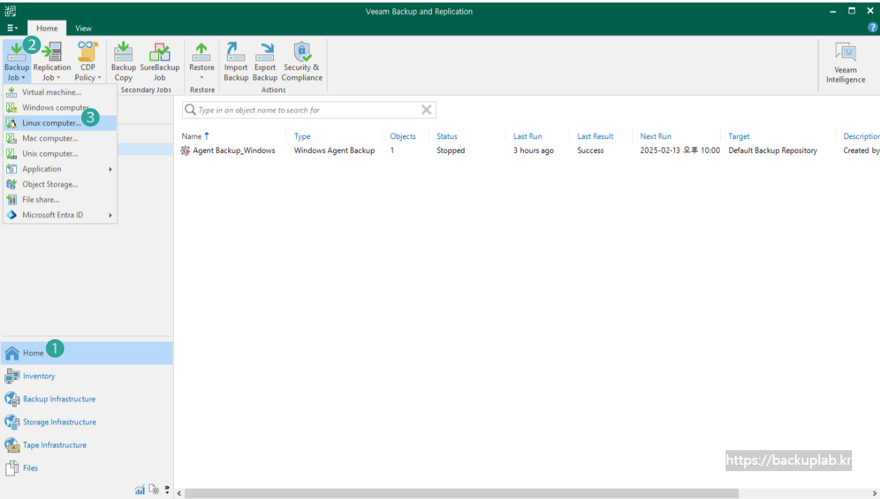 Veeam Agent for Linux로 보호되는 컴퓨터의 데이터를 백업하려면 Veeam Backup & Replication에서 Veeam Agent 백업 작업을 구성할 수 있습니다.