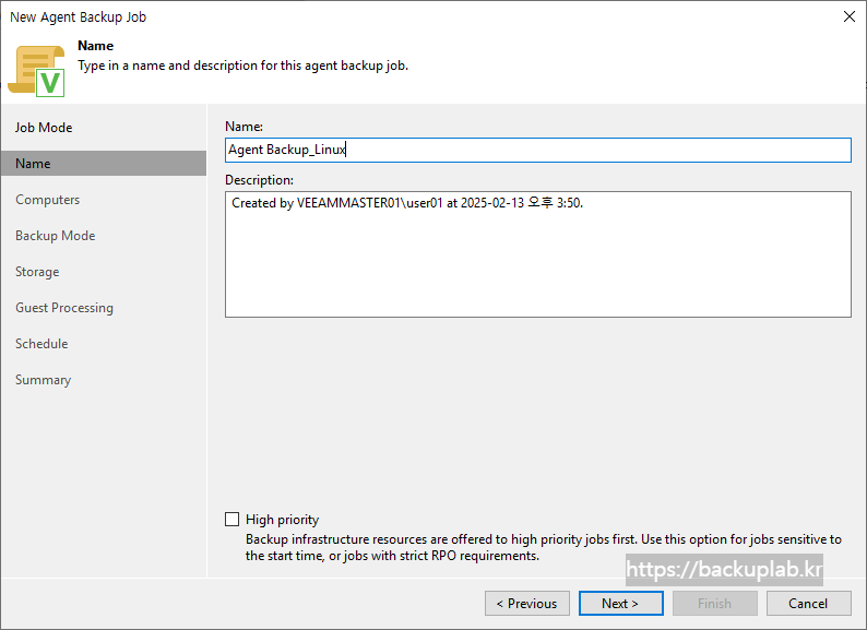 Summary 단계에서 구성된 Veeam Agent 백업 작업의 설정을 검토 후, Finish 클릭.