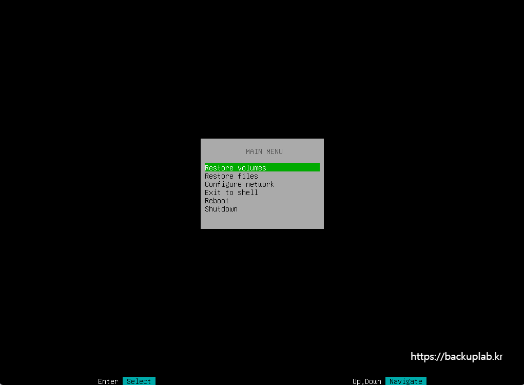 선택한 디스크에 볼륨을 복원하려면 Restore from... 옵션을 선택하고, [Enter] 입력.