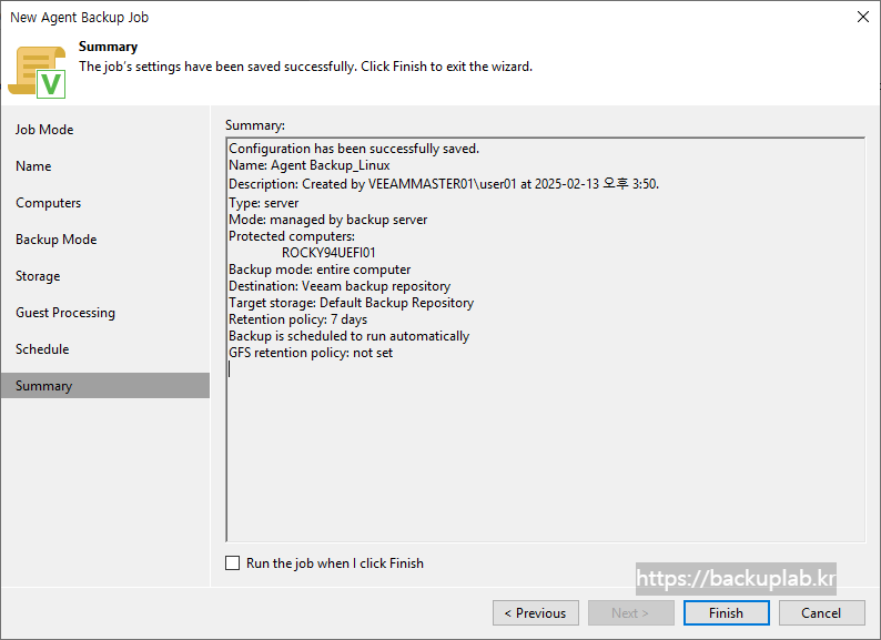 Summary 단계에서 구성된 Veeam Agent 백업 작업의 설정을 검토 후, Finish 클릭.