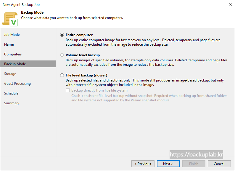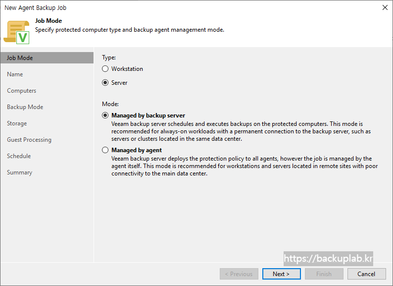 - Managed by backup server - Veeam 백업 서버가 보호되는 컴퓨터의 백업 일정 및 실행 권한을 갖음.