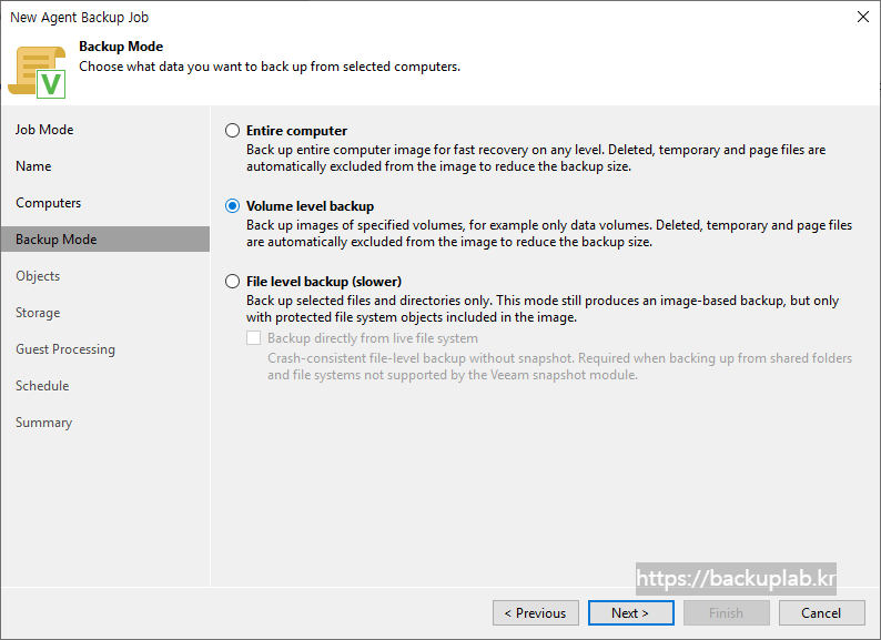 Backup Mode 단계에서 특정 컴퓨터 볼륨의 백업을 만들려는 경우, Volume level backup 을 선택.