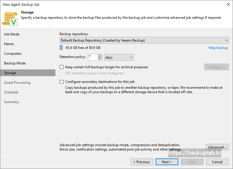 - Configure secondary destinations for this job - 백업 작업으로 생성된 백업 파일을 보조 대상(백업 저장소 또는 테이프)에 보관하기 위해 선택.