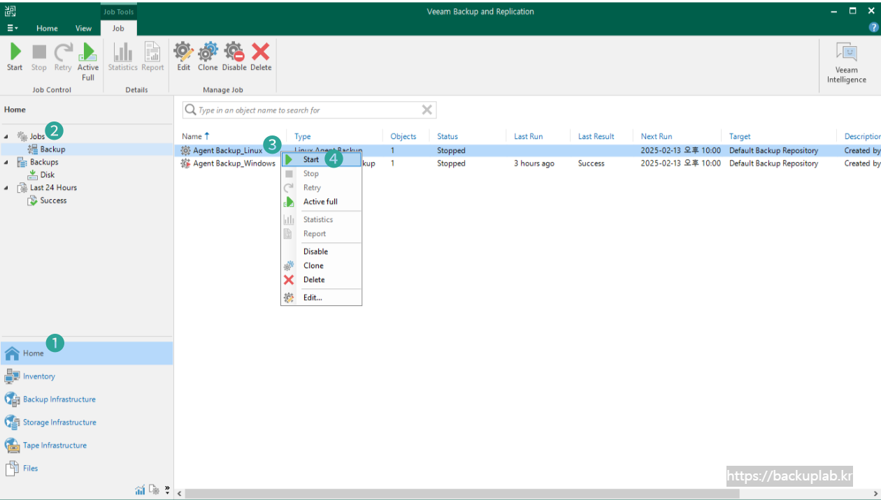 Veeam Agent 백업 작업을 수동으로 시작하기 위해: