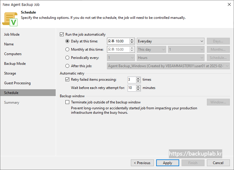 - Automatic retry : 작업이 실패할 경우 백업 작업을 다시 실행해야 하는지 여부를 정의. 작업을 실행하기 위한 시도 횟수와 그 사이의 시간 간격을 정의.