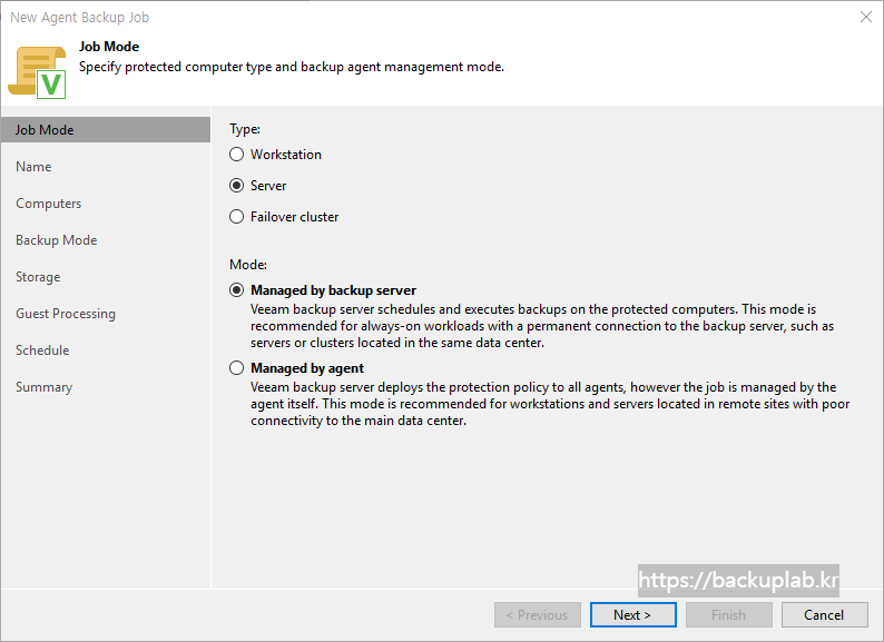 Job Mode 단계에서 백업 서버에서 관리하는 Veeam Agent 백업 작업에 대한 보호 설정(Type, Mode)을 지정.