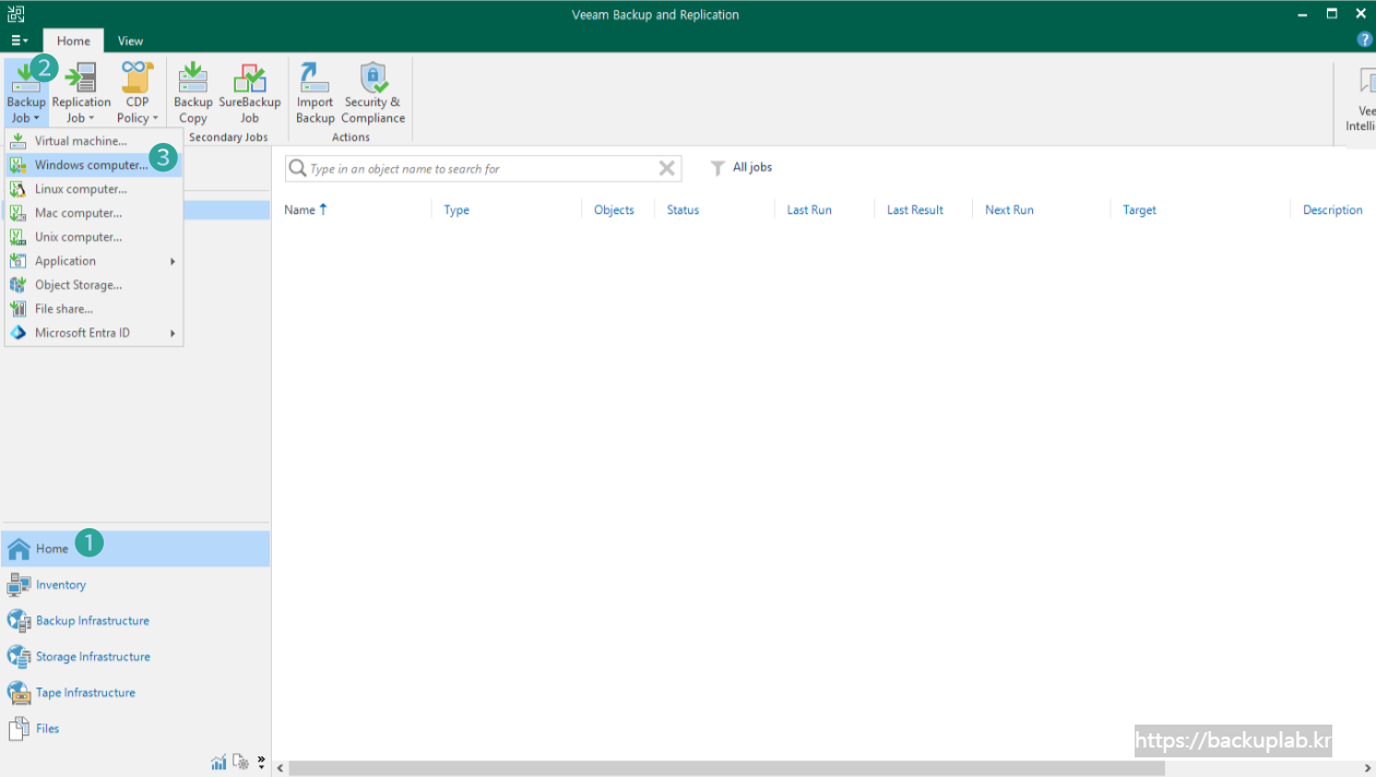 Veeam Agent for Microsoft Windows로 보호되는 컴퓨터의 데이터를 백업하려면 Veeam Backup & Replication에서 Veeam Agent 백업 작업을 구성할 수 있습니다.